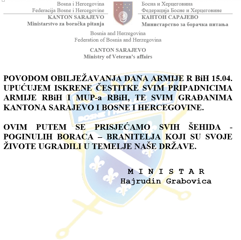POVODOM OBILJEŽAVANJA DANA ARMIJE R BiH 15.04. UPUĆUJEMO ISKRENE ČESTITEKE SVIM PRIPADNICIMA ARMIJE RBiH I MUP-a RBiH, TE SVIM GRAĐANIMA KANTONA SARAJEVO I BOSNE I HERCEGOVINE.